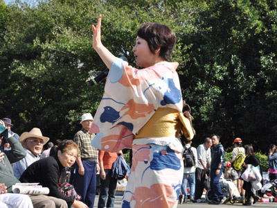 今年は暖かく快晴の中でのステージ。 らら音頭さくらは旬、東京五輪音頭、東京音頭など7曲を唄い踊りました。 |